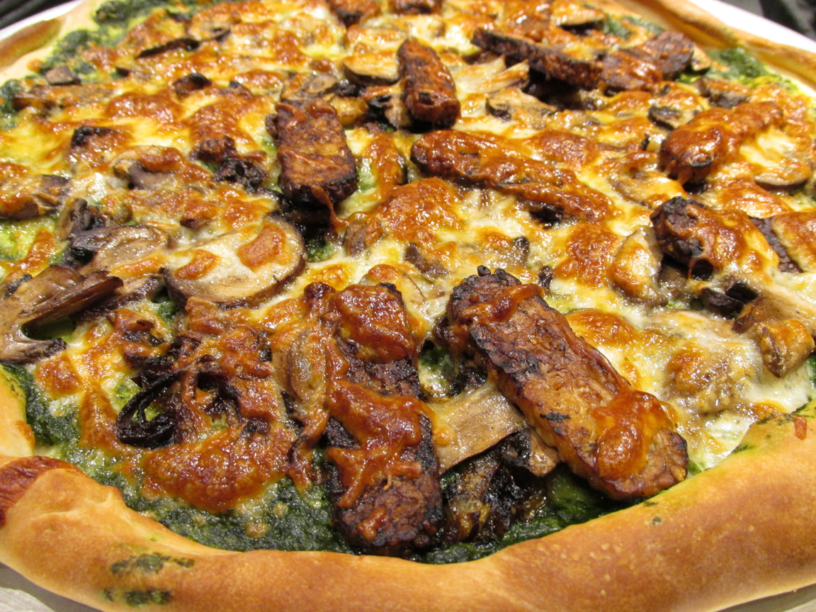 - Spread the Spinach Pesto to cover crust. top with onions, mushrooms, tempeh and mozzarella.