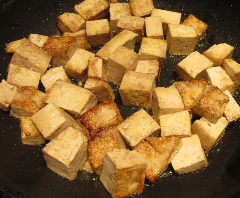 - In a large pan heat oil and add Tofu Cubes, brown, add the soy sauce and continue frying until golden brown.