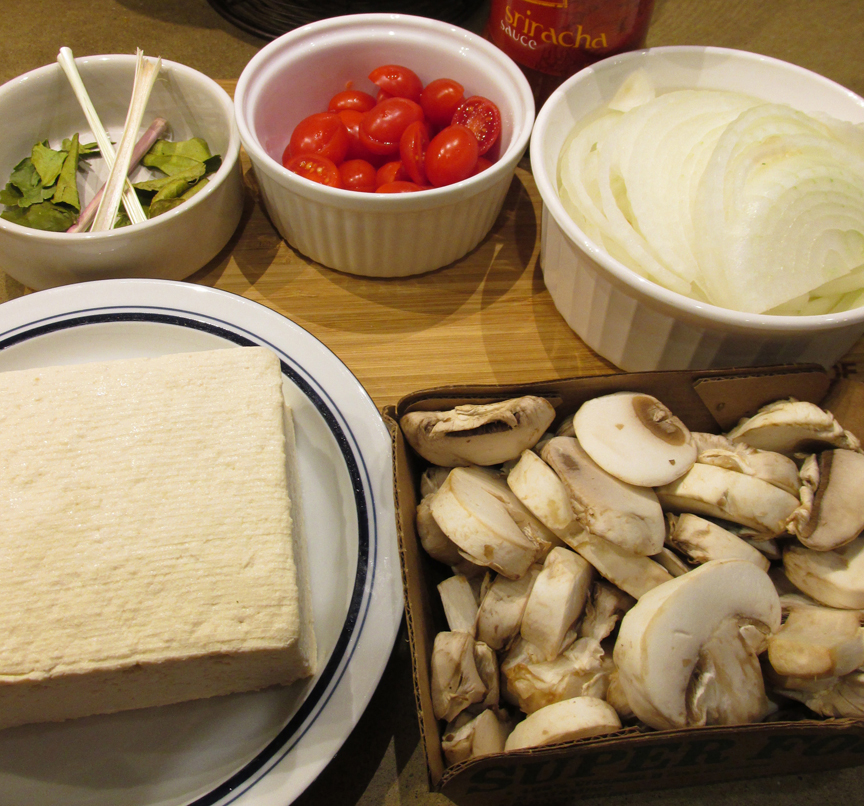 - In a large saucepan, bring the vegetable broth to a boil. Once boiling, add the lime leaves and lemongrass and boil for 5 minutes. Add the mushrooms, soy sauce, Sriacha Sauce, lime juice, tomatoes and onions.