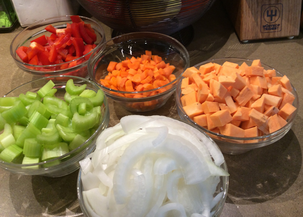 This is a good soup for the cold nights we have been having here. This is my take on an African Peanut soup. the peanut butter is subtle and by pureeing the stock and vegetables it adds a rich and hearty taste. I might also add some fresh ginger and maybe some peanuts sprinkled on top. Or even add some coconut milk…