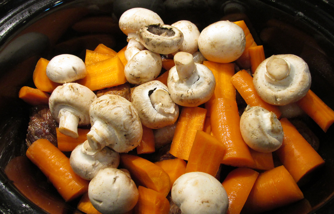 2. Add onions to pan; cook 1 minute on each side or until browned. Add onions to slow cooker. Add tomato paste to the oil left in the pan; cook 1 minute, stirring constantly. Add 1/2 cup wine, scraping pan to loosen browned bits; cook 2 minutes or until half of liquid evaporates. Add stock and pepper; bring to a simmer. Carefully pour stock mixture into slow cooker; nestle thyme sprigs into liquid. Top beef mixture with mushrooms; scatter carrots and parsnips over the top.