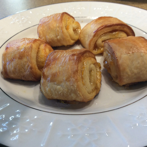 Unwrap one roll and set on a cutting board. Using a serrated knife and a ruler, cut the roll into 1-1/4-inch-wide pieces. Arrange cookies seam side down 1 inch apart on the cookie sheets. Repeat with the remaining rolls. Lightly brush the tops with the egg mixture (you won’t need it all). Bake until the rugelach are golden brown, 28 to 30 minutes, swapping the cookie sheets’ positions about halfway through. Let cool on the sheets for about 20 minutes. Transfer to a rack to cool completely.