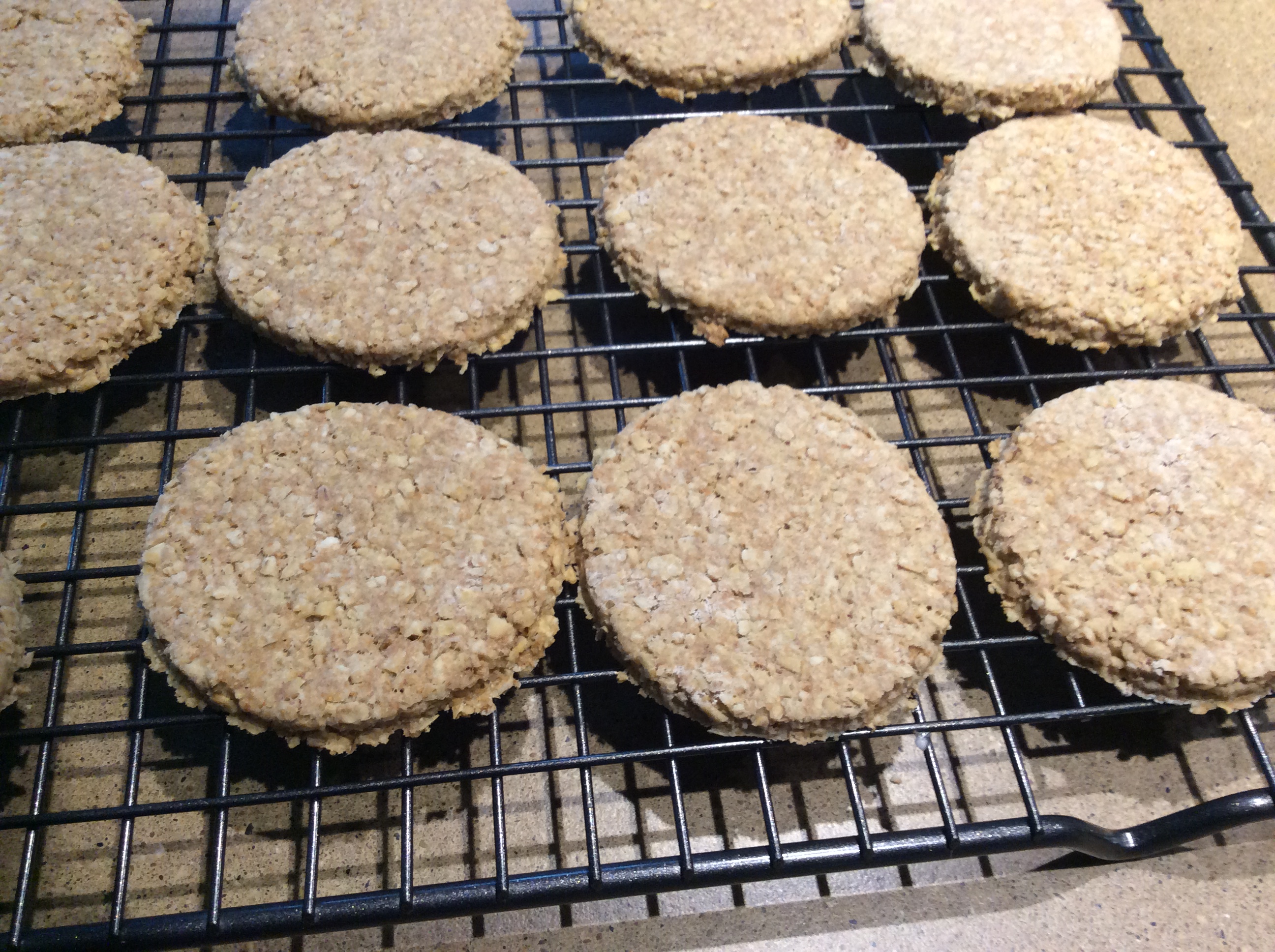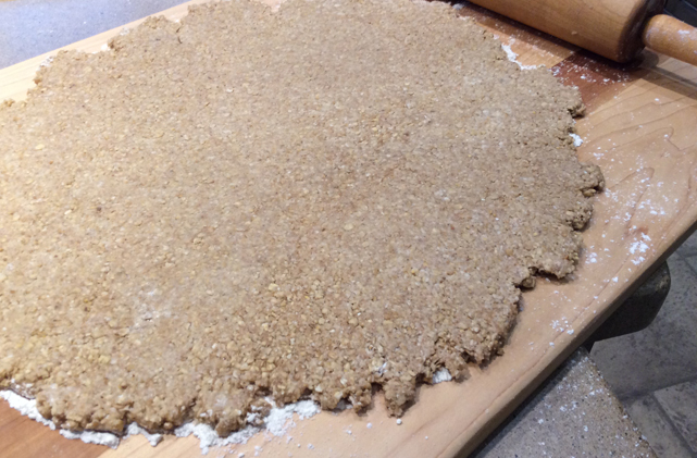 I bought a small bag of scottish oatcakes last week and they were wonderful (and expensive) so i thought maybe I could recreate them. I took some liberties here but these are great with tea. You can put jam on them or make them savory with cheese or smoked salmon. I tweaked it a bit to make it slightly sweeter for my husband. If you want them more traditional reduce the sugar to 2 tsps. I doubled the recipe. You can also sprinkle them with a bit of sugar or fine sanding sugar is you want. This is tweaked from a Bob’s red Mill recipe.