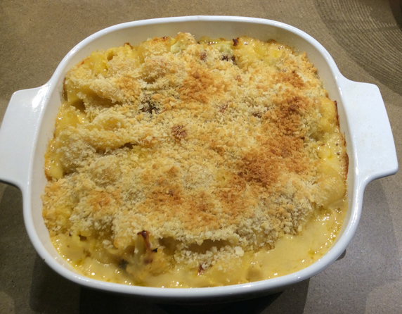 I love mac and cheese. My mom makes the best baked mac and cheese (loaded with fatty goodness) but this has all sorts of gooey wonderfulness without quite so much guilt..and hidden veggies. I think this would be great for kids, you don’t even realize there is cauliflower in with the pasta. I served it as a side dish with chicken but it would make a great vegetarian entree. This is adapted from a Vanilla and Bean blog post. You could also add some caramelized onions.