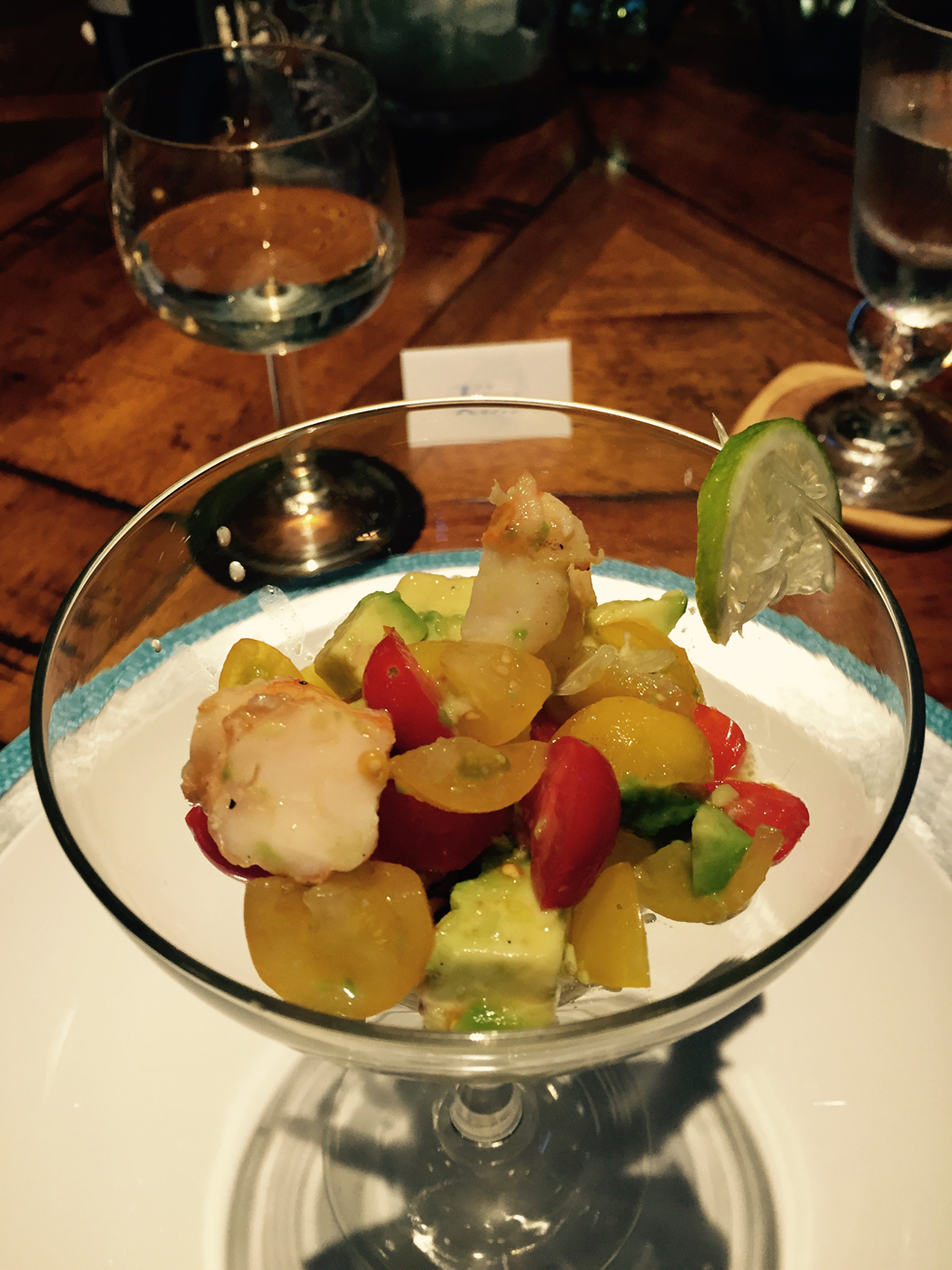 For the shrimp: Heat a gas grill to medium high or prepare a medium-hot charcoal fire. (If using charcoal, be sure the grate is hot, too.) Put the prawns in a large bowl and mix with the olive oil until well coated. Put the shrimp on the grate directly over the heat and grill until pink and almost cooked through, 4 to 5 minutes, turning once halfway through. Let cool completely.For the “Margarita”: An hour before serving, whisk together the tequila, lime juice, orange juice and green Tabasco. Peel the shrimp, cut them into large pieces (about 1/2 inch), and toss with the tequila mixture. Cover and refrigerate for 1 hour. Just before serving, season the shrimp mixture with salt and pepper. (Alternatively, omit the kosher salt at this stage and sprinkle on a coarse sea salt like fleur de sel just before serving.) Gently fold in the tomatoes, avocados, and scallions, mixing well. Using a slotted spoon, portion the mixture into margarita glasses. Garnish with a wedge of lime, and the optional sea salt and salt the rim of the glass.