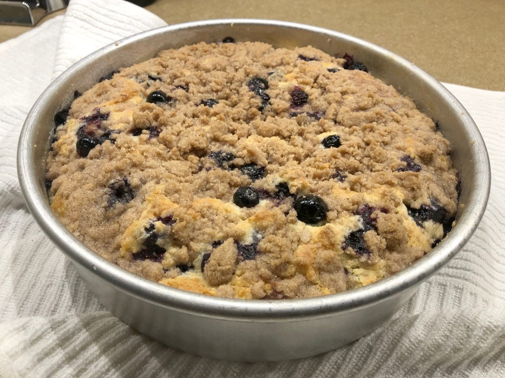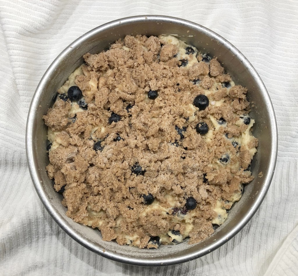 Scoop cake batter into prepared pan and smooth so that it is flat. If using walnuts, scatter them on top. Sprinkle with prepared streusel. Bake in heated oven for 30-40 minutes, or until a toothpick inserted into the middle of the cake comes out batter-free. You can let the cake cool complete in the pan on a rack.