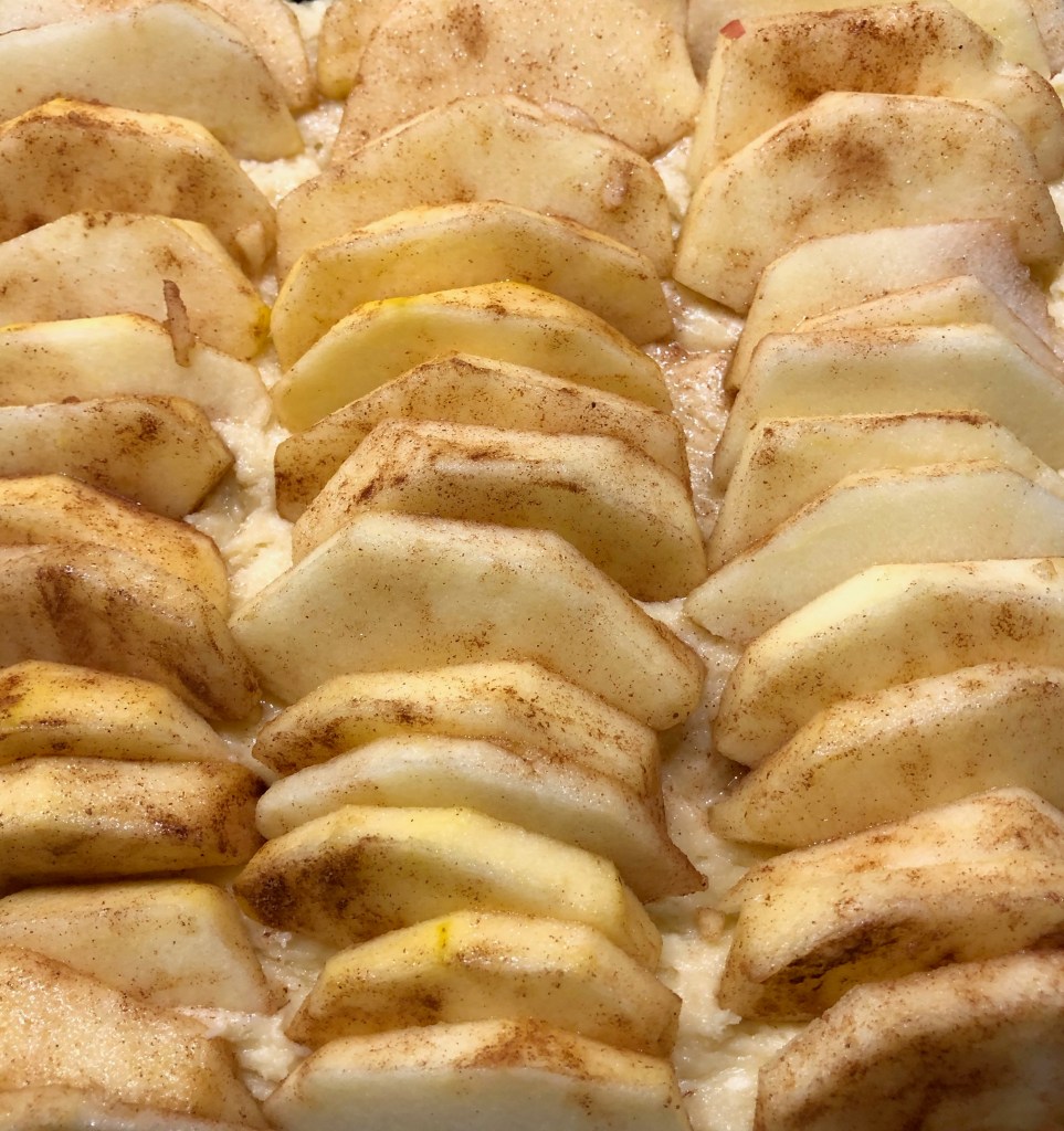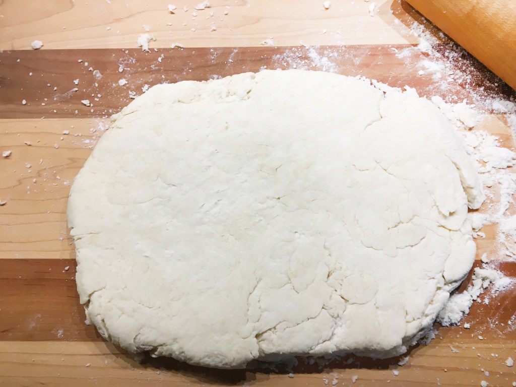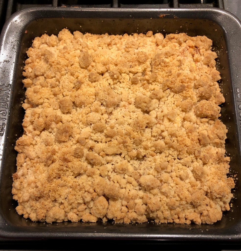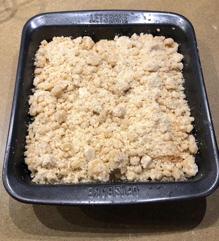 - Sprinkle the remaining dough over the peaches. If you like you can make some big crumble pieces by squeezing crumble mixture in your hand before sprinkling. Use your fingertips to press to the crumbles so they can stick to peaches.