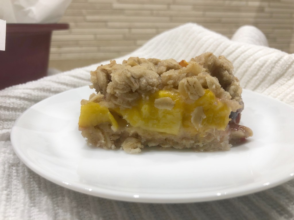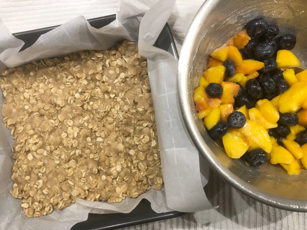 - Next, cover the crust with the peach mixture but leave the excess liquid in the bowl. You may want to use this liquid later if there is too much left. (You can place that liquid into a small pan, and when the mixture thickens you can remove it from the heat and drizzle the sauce on top of the baked bars. )