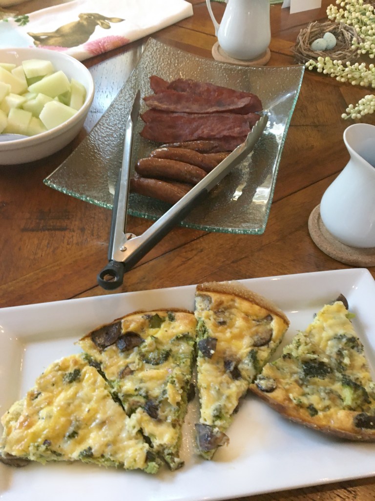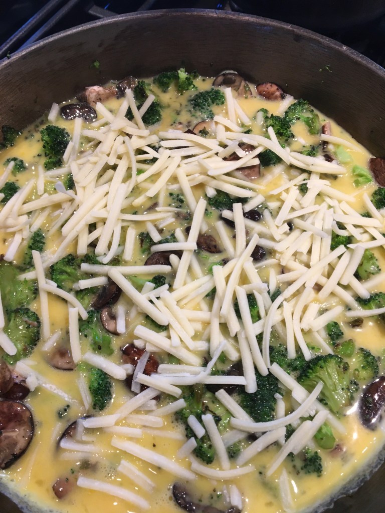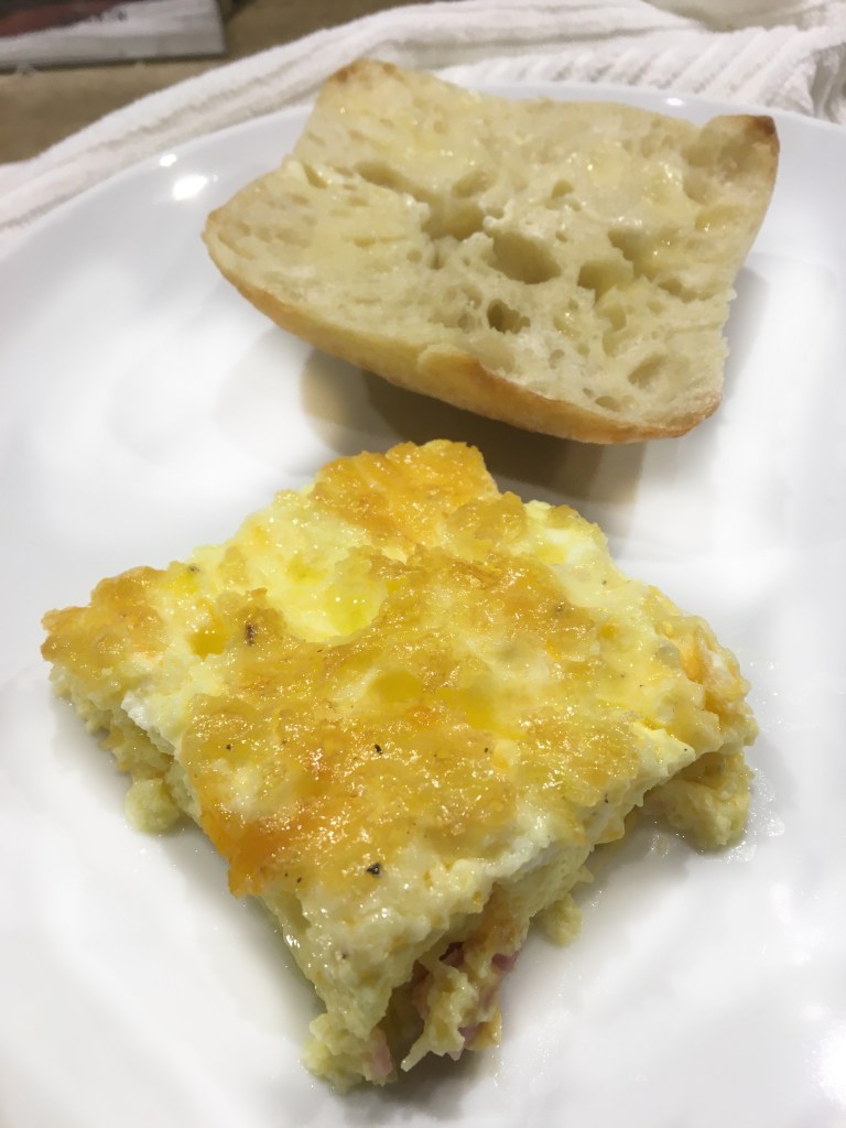 This is a mix of several recipes. Some call for adding hash browns. I went for straight up eggs, cheese and ham. This is perfect for company, comes together quickly and even is good warmed up the next day.