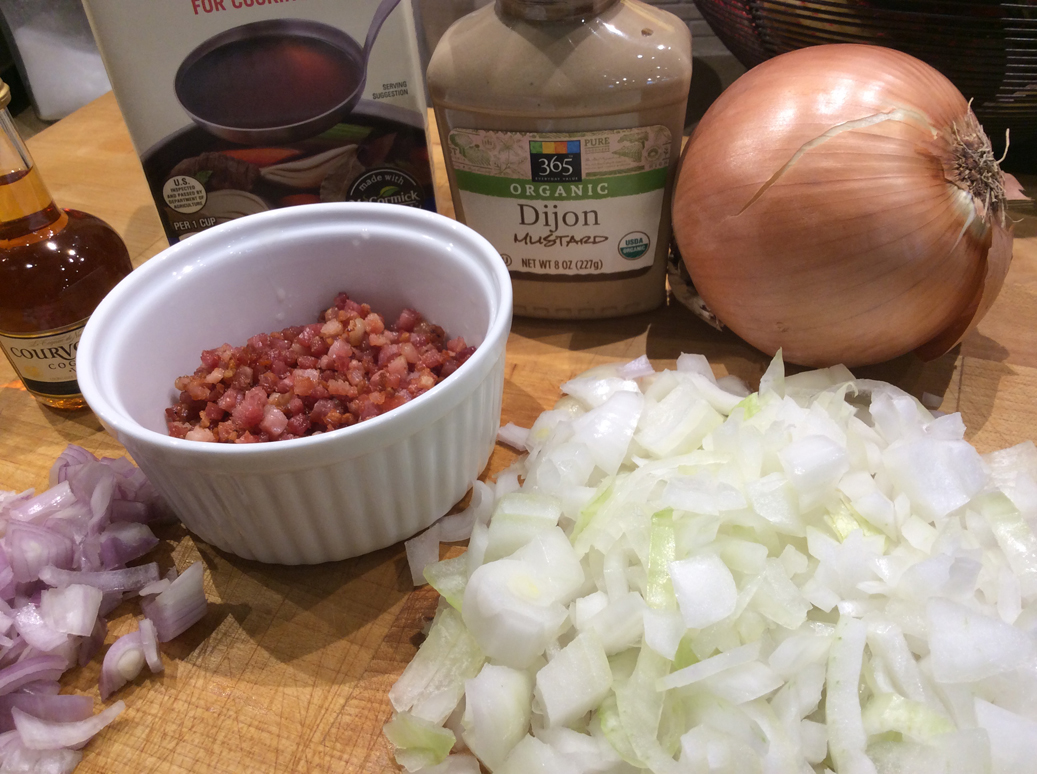 Add Cognac to the empty pan, and cook, stirring, until the bottom is deglazed and any crusted-on bits come loose. Add stock, smooth Dijon mustard. Whisk to blend, then return meat and onion mixture to pan. Lower heat, cover pan partway, and simmer gently until meat is very tender, about 1 1/4 hours.